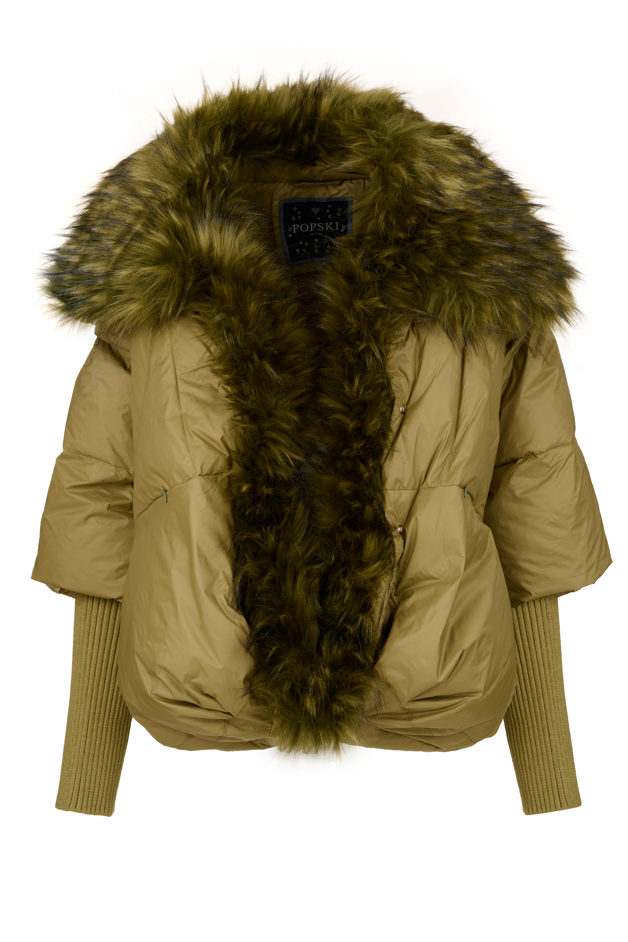 * An image of a model wearing a green Popski London jacket