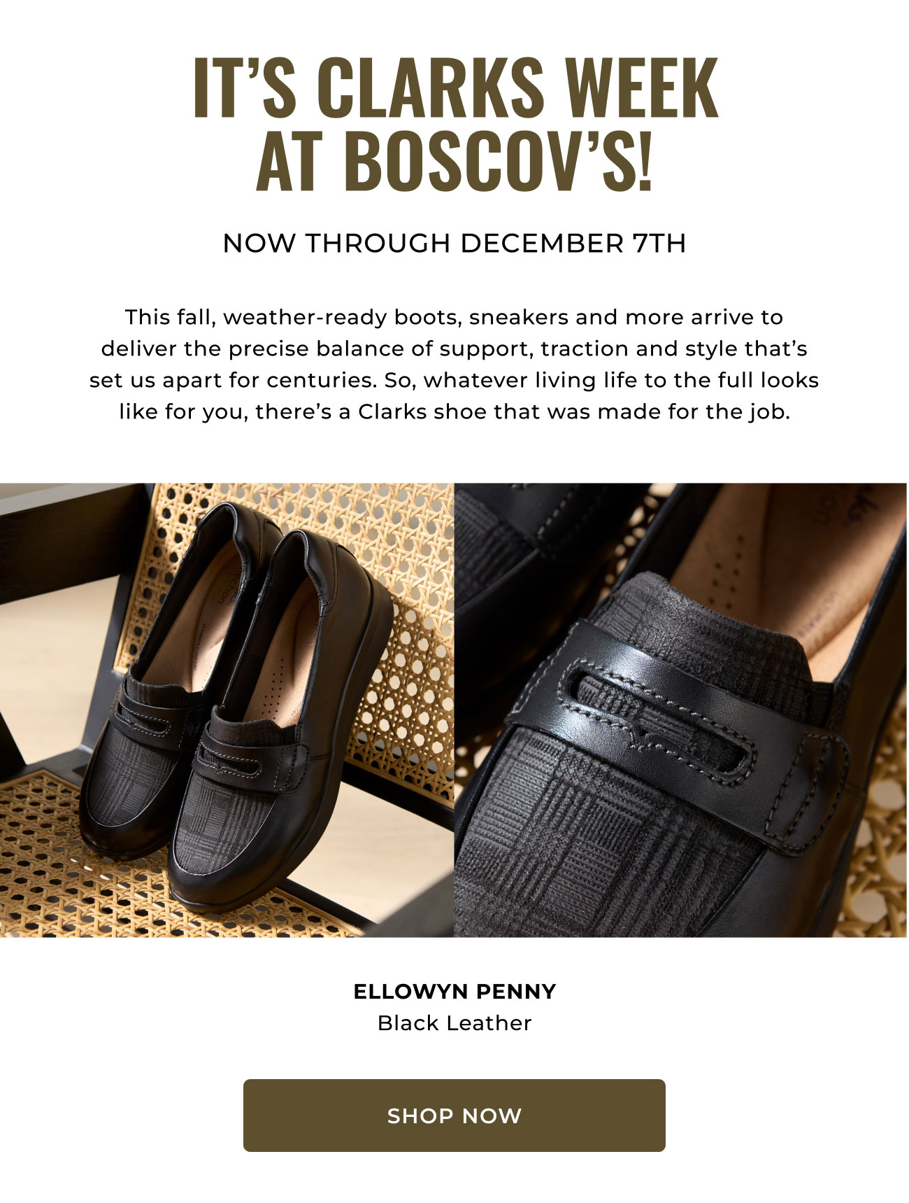 This email newsletter includes ads for famous shoe brand Clarks. It features pictures of their footwear alongside clickable links that redirect to the website. The email also displays advertisement links to various categories on the website such as clothing, shoes, jewelry, new arrivals, etc. Also included are social media links to Facebook, Instagram, TikTok, and YouTube. The newsletter also includes a section called "Bottom Nav Title" that shows clickable website links to various categories of clothing on that website. There is another section titled, "FOOTER LINKS" that contains clickable links to women's dresses, handbags, jewelry, and other categories. The email includes various policy-related links such as "See shipping offer exclusions" and "See our retail pricing policy," but the full text of the terms is not included. The newsletter is concluded with a section about the email message with information on how to prevent receiving further marketing solicitations and a link to click on to unsubscribe from the mailing list.