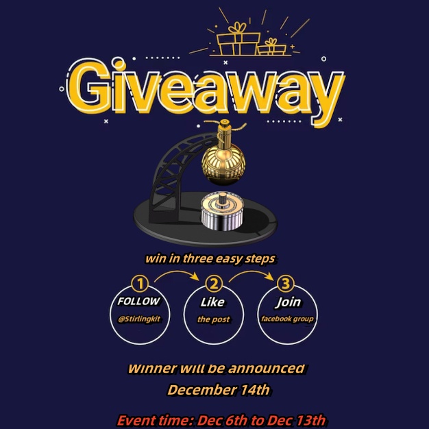 A company called Contaya (sometimes referred to as Stirlingkit) has upgraded their product line of turbofan engines. They invite you to contribute to their product improvement process and ask for feedback and ideas. There is an image of the engine shown in the very beginning of the newsletter. Also pictured in the newsletter are multiple products from Contaya. Contaya is currently offering holiday promotions including giveaways and discounts.