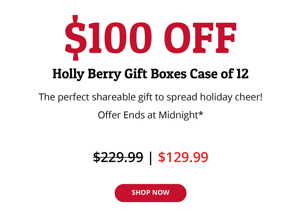 Mrs. Fields Newsletter: $100 off Holly Berry Gift Boxes Case of 12