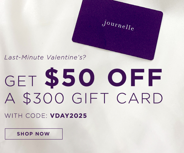 Un boletín de noticias por correo electrónico de Journelle anuncia un descuento del 25% en su colección Anais utilizando el código SCARLET25 y tiene un descuento por separado de $50 para tarjetas de regalo electrónicas de $300 utilizando el código VDAY2025. El boletín de noticias también contiene enlaces al sitio web, localizador de tiendas e información de contacto de la empresa.